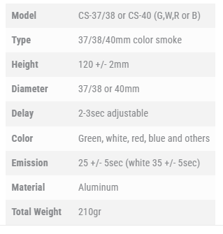 We manufacture color smoke cartridges on 37mm, 38mm or 40mm. Our model SC-37/38/40-G (green)/W (white)/R (red)/B (blue), are color smoke cartridge use for marking signaling. These cartridge are compatible with 37/38/40mm smooth or rifle bore.
